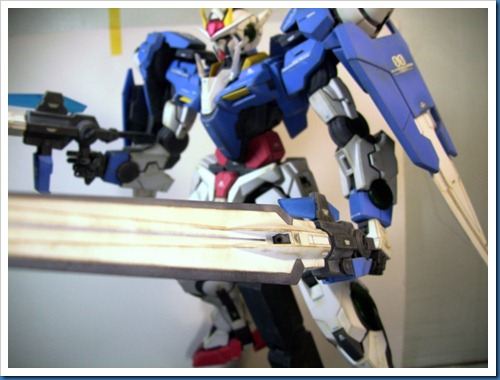 GN劍Ⅲ──劍模式。其實這邊已經開始曝露出這款套件真正的問題點了…GN劍Ⅲ太重太長,肩膀的轉軸根本撐不住,會一直往下滑啊啊啊~囧